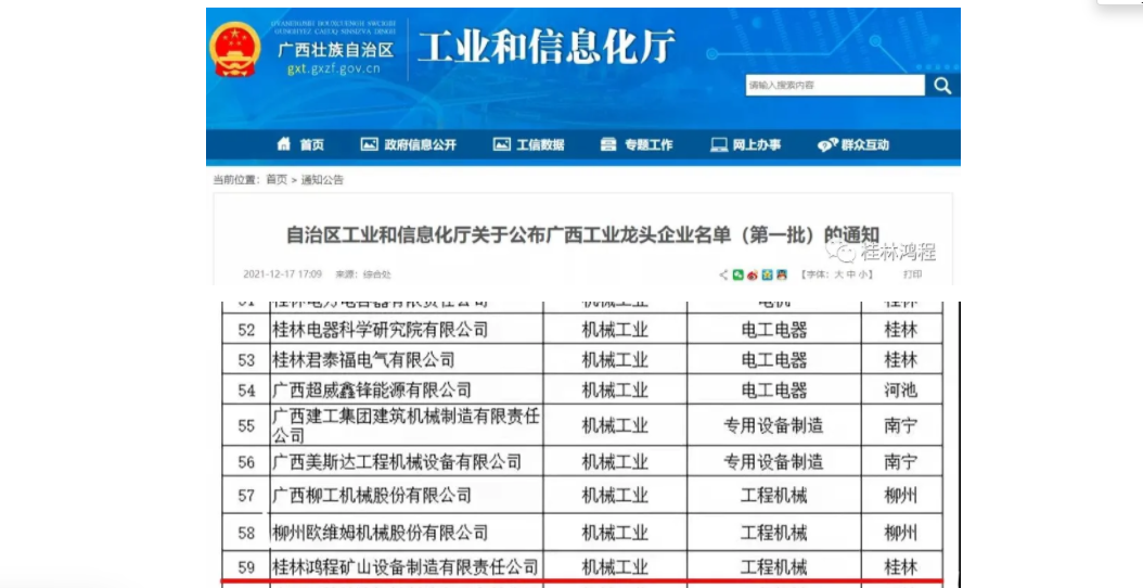祝桂林鴻程礦山機械公司入選廣西工業(yè)龍頭企業(yè)!近日,自治區(qū)工業(yè)和信息化廳公布第一批廣西工業(yè)龍頭企業(yè)名單,共105家企業(yè)入選。其中,桂林鴻程礦山機械公司成為桂林21...